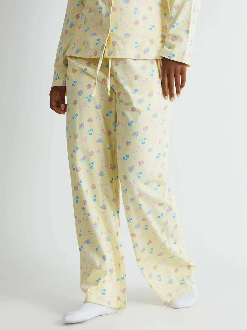 Add a fresh and fruity twist to your loungewear with the Skinnydip Yellow Ditsy Fruit Pyjama Set. Bursting with vibrant color and a playful fruit print, this set is the perfect blend of fun and comfort. Machine washable. 100% Cotton.