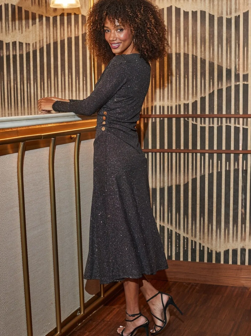 Sosandar Black Glitter Ruched Button Detail Fit & Flare Dress