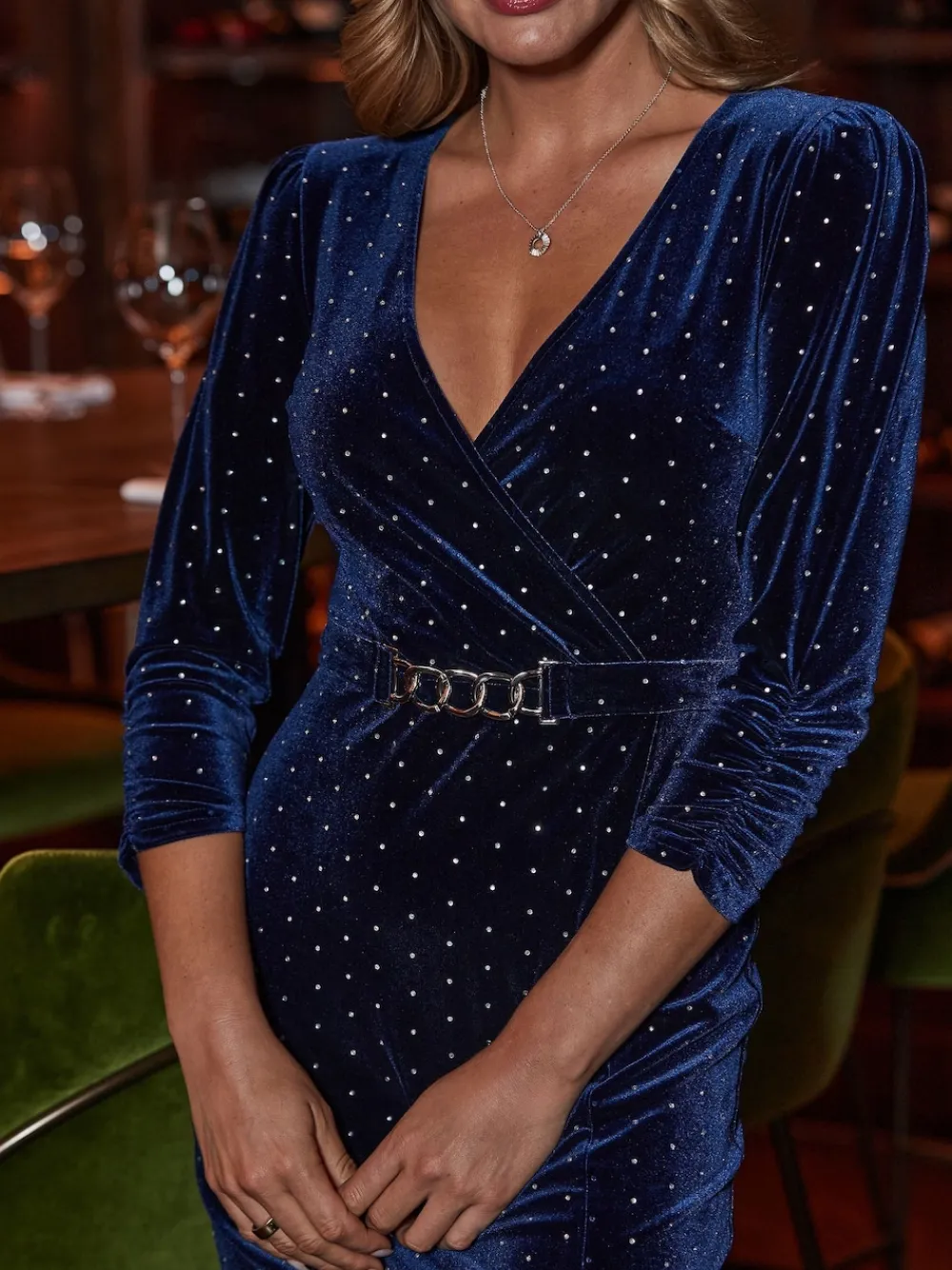 Glam mode: activated, sumptuous stretch velvet for a luxe finish (and a whole loada comfort), adorned with all-over shimmering embellishment, framed by a flattering v-neckline, luxe chain belt shows off your waist, add silver heels for zero-stress party dressing. Model is 5ft 9″ and wears a UK size 8. Hand wash only. 93% Polyester, 7% Elastane.