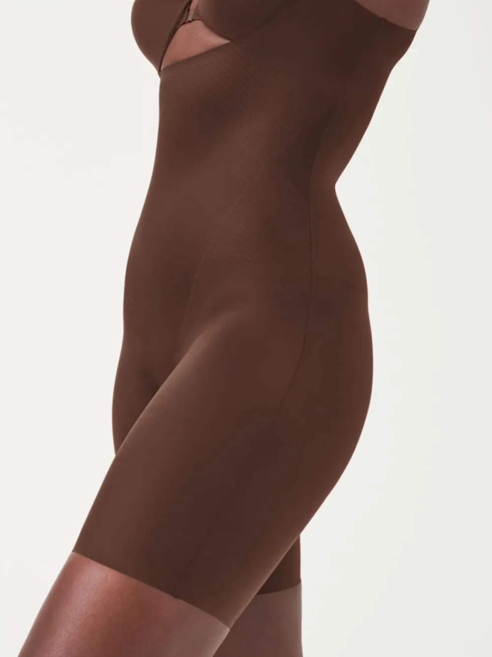 Experience lightweight and powerful compression with our SPANXshape™ Invisible Open-Bust Mid-Thigh Bodysuit. Featuring advanced single-layer Printed Power® shaping technology made with LYCRA® FitSense™ Print Technology, this bodysuit includes targeted tummy control panels that wrap around for 360-degree shaping and full body control. Designed with ultra-thin, breathable fabric that is moisture-wicking and quick-drying, a cotton gusset for comfort, an open bust so you can wear your favorite bra, adjustable straps that eliminate rolling, and no-dig flexible leg openings, this shapewear prevents thigh-chafing and goes undetected under any outfit. Main 55% Nylon, 45% Lycra® Elastane. Gusset 80% Nylon, 20% Elastane.