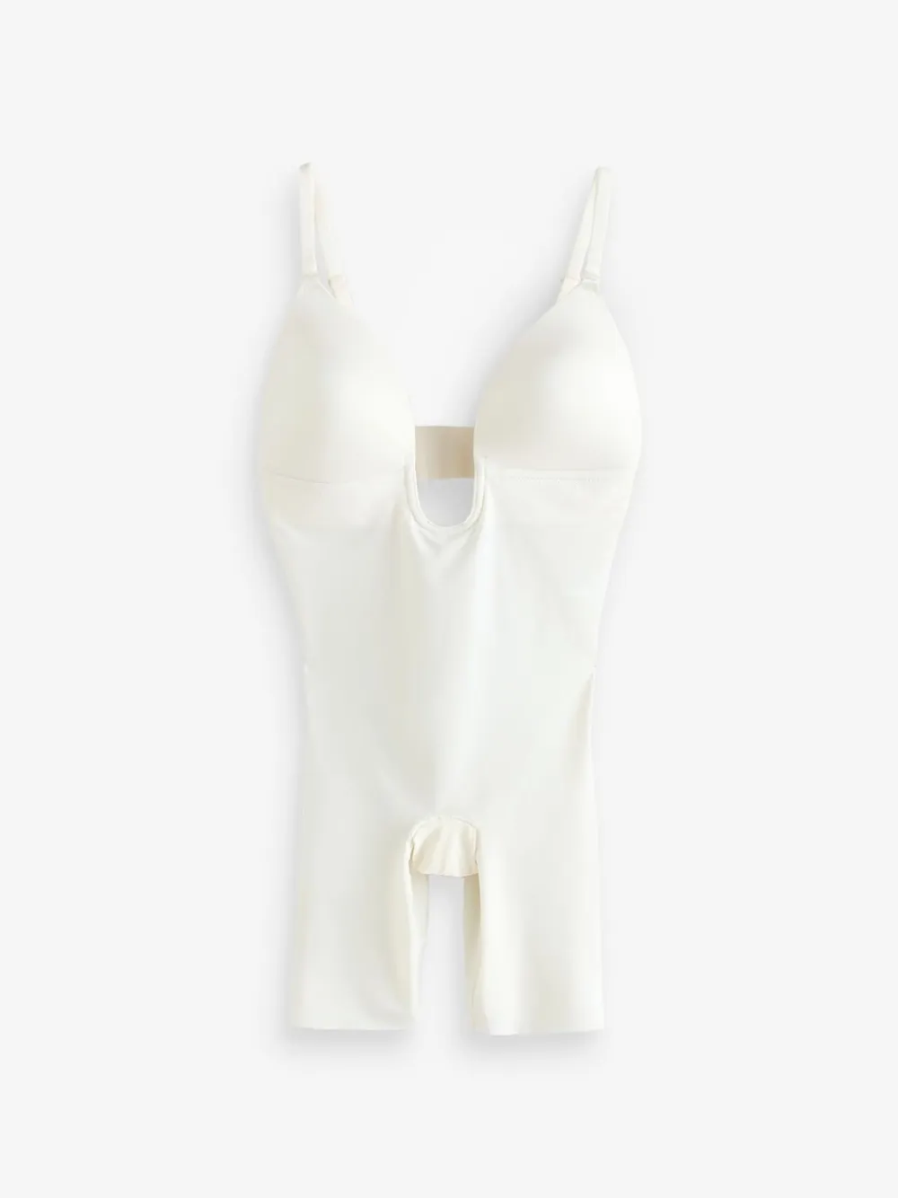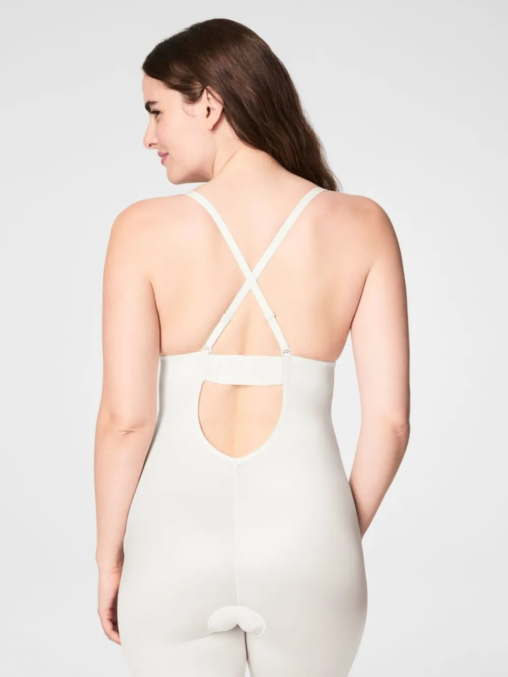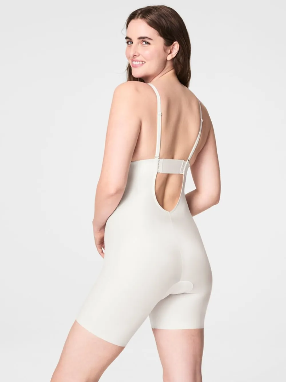 This low-back mid-thigh bodysuit provides all-over compression to shape and support your figure. Designed with cling-free fabric, a plunging neckline, and innovative low-back design, it goes undetected beneath your most daring dresses and special occasion outfits. Plus, with a no-slip silicone waistband that eliminates rolling and folding, free-cut hems that don’t squeeze or dig, and fabric that prevents thigh chafing, this bodysuit shapewear is perfect for all-night wear. Adjustable and convertible straps make this your go-to, versatile bodysuit for those very specific silhouettes that require very specific shapewear. Main 51% Elastane, 49% Nylon. Gusset 80% Nylon, 20% Elastane.