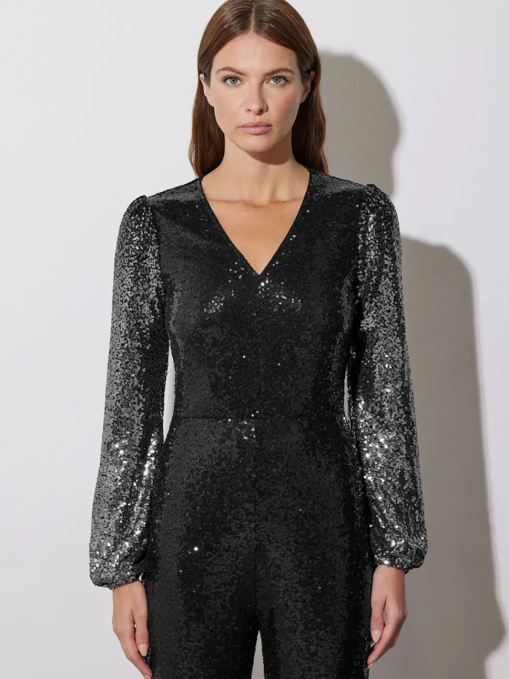 Style Notes: Make a captivating entrance in our new sequin jumpsuit. Crafted from a figure-fitting fabric, it features sequin embellishments, a deep V-neckline, and is complete with a zip fastening. Style with heels for a timeless look. Machine washable. 95% Polyester, 5% Elastane.