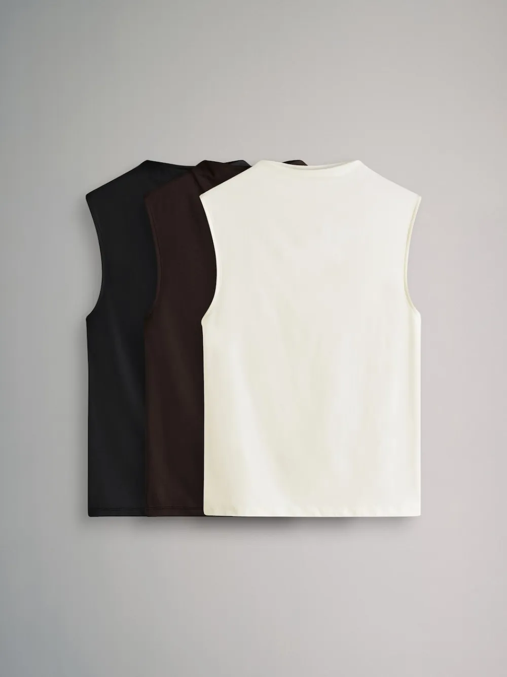 THE SET’s 3 Pack Soft Touch High Neck Tops provides three elegant, elevated pieces that seamlessly transition from work to weekend. This versatile multipack includes fitted sleeveless tops in essential colours: classic black, rich chocolate brown and crisp white. Crafted from a super soft touch fabric, each top features a sophisticated high neck, making them ideal for refined layering or wearing as standalone pieces. 3 pack High neck Sleeveless 3 x T-shirt 93% Nylon, 7% Elastane.