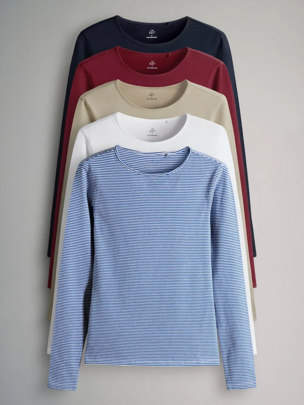 A style staple, level up your rotation with our multipack of crew neck T-Shirts. Part of THE SET’s carefully considered capsule collection, this pack includes five tops each with a simple crew neck and long sleeves made in a soft and stretchy cotton and designed for a fitted look. The perfect starting point for any outfit and ideal for layering. 5 Pack Crew neck Long sleeves Soft and stretchy cotton Fitted look 5 x T-shirt 95% Cotton, 5% Elastane.