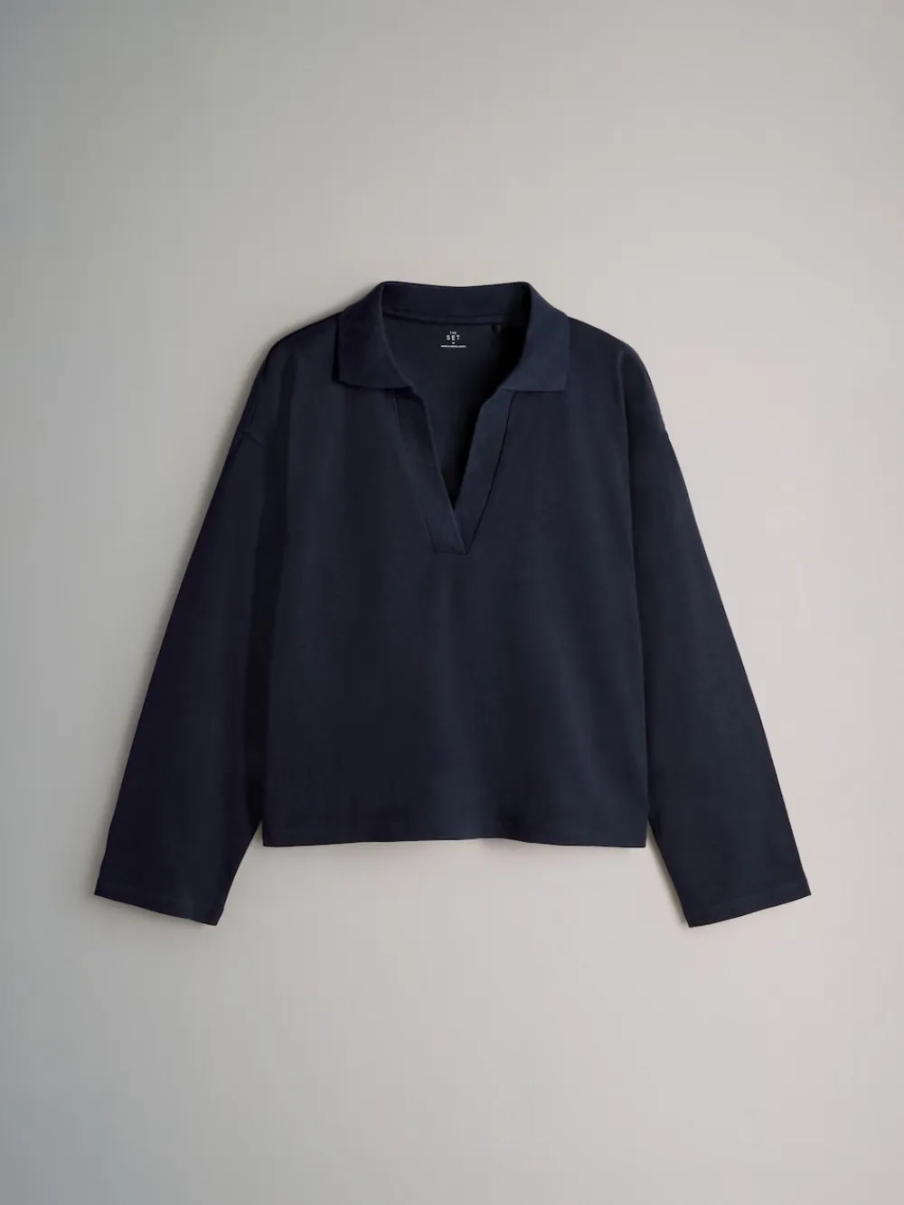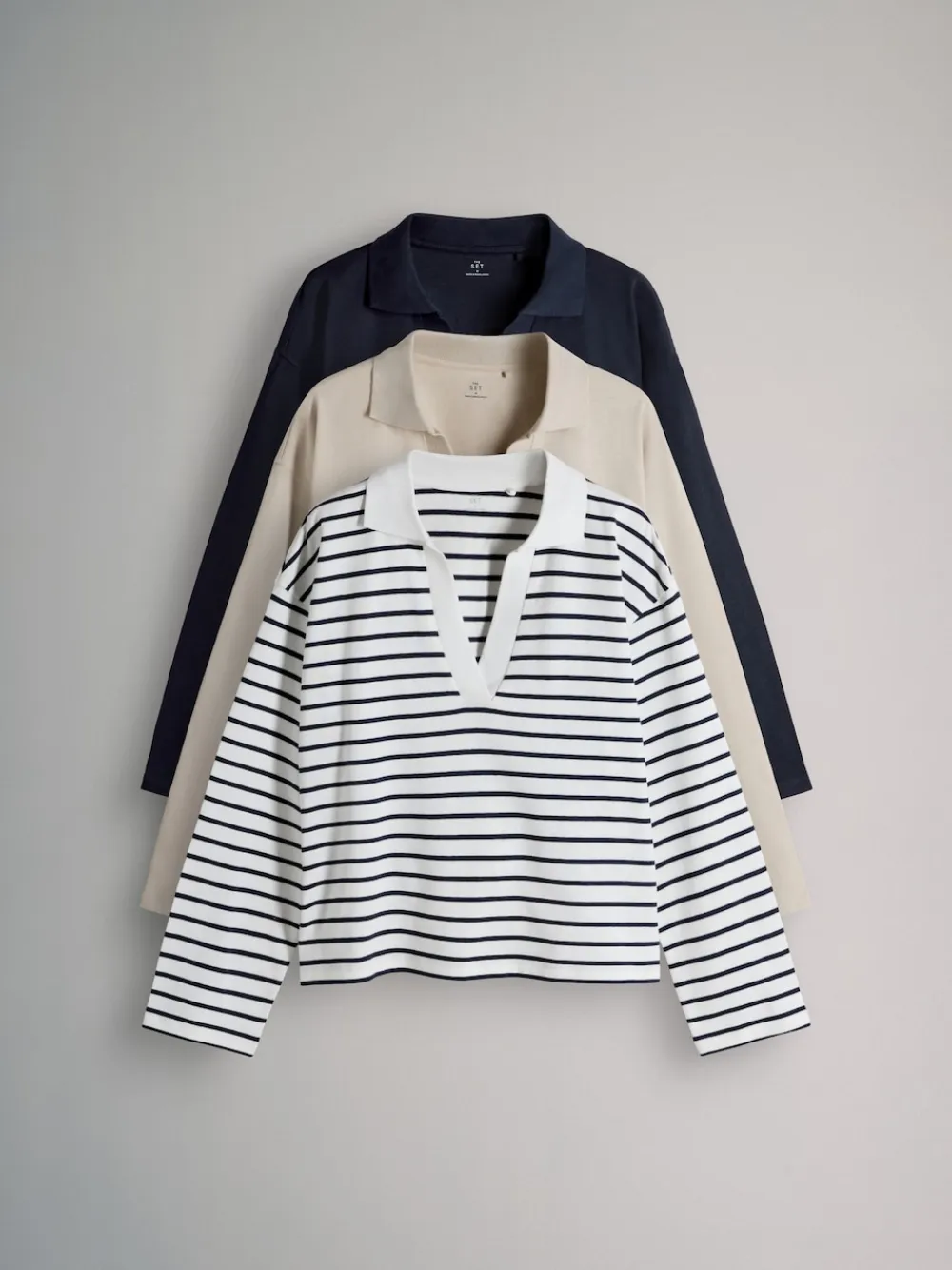 Refresh your casual rotation with this 3 pack of long sleeve heavyweight rugby T-shirts from THE SET. These tops are designed with a contemporary trophy neck and classic long sleeves, offering a modern silhouette that is perfect for layering. The pack includes three versatile colorways: a deep navy, a neutral stone and a traditional navy-and-white stripe. Crafted from a substantial heavyweight cotton fabric, these T-shirts provide a premium feel and durable comfort for effortless everyday wear. 3 pack Trophy neck Long sleeve 3 x T-shirt 100% Cotton.