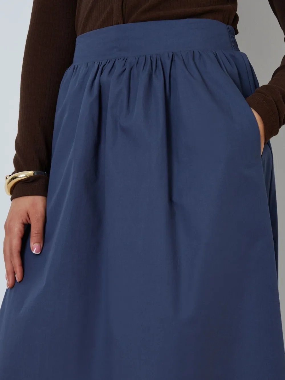 Effortlessly transition from casual to chic with this pull-on cotton poplin maxi skirt from Threadbare. Our maxi skirt has a wide waistband that s elasticated at the back, making this easy to throw on and comfortable to wear, while two side pockets also make this a practical piece. The fabric gathers at the waistband to create full volume and falls to the floor with a pleated effect. Style with a linen blouse or waistcoat with sandals for simple seasonal styling. The model wears a UK size 8. Machine washable. 100% Cotton.