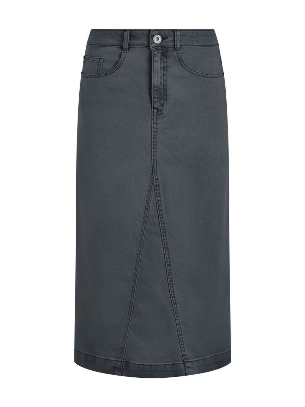 The Juda Longline Denim Skirt will go so well with plenty of different looks this season. Team with a T-Shirt for warmer days, or layer with a knit or jacket for cool evenings and early mornings. Looks great with trains or boots. Midi length. Zip fly with top button. Belt loops. Hand slip pockets. Machine washable. 98% Cotton, 2% Elastane.