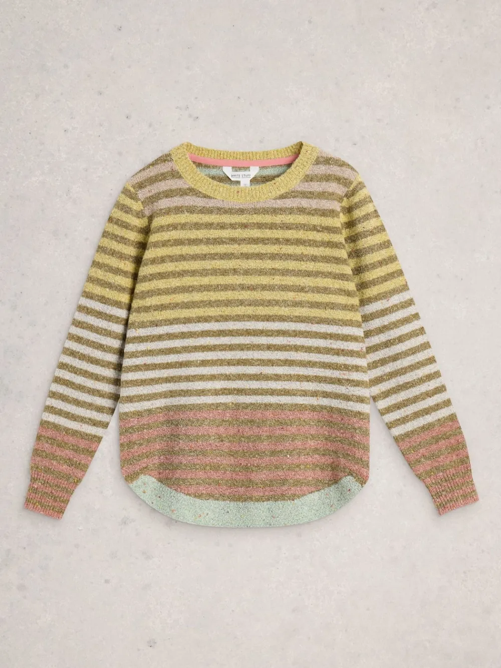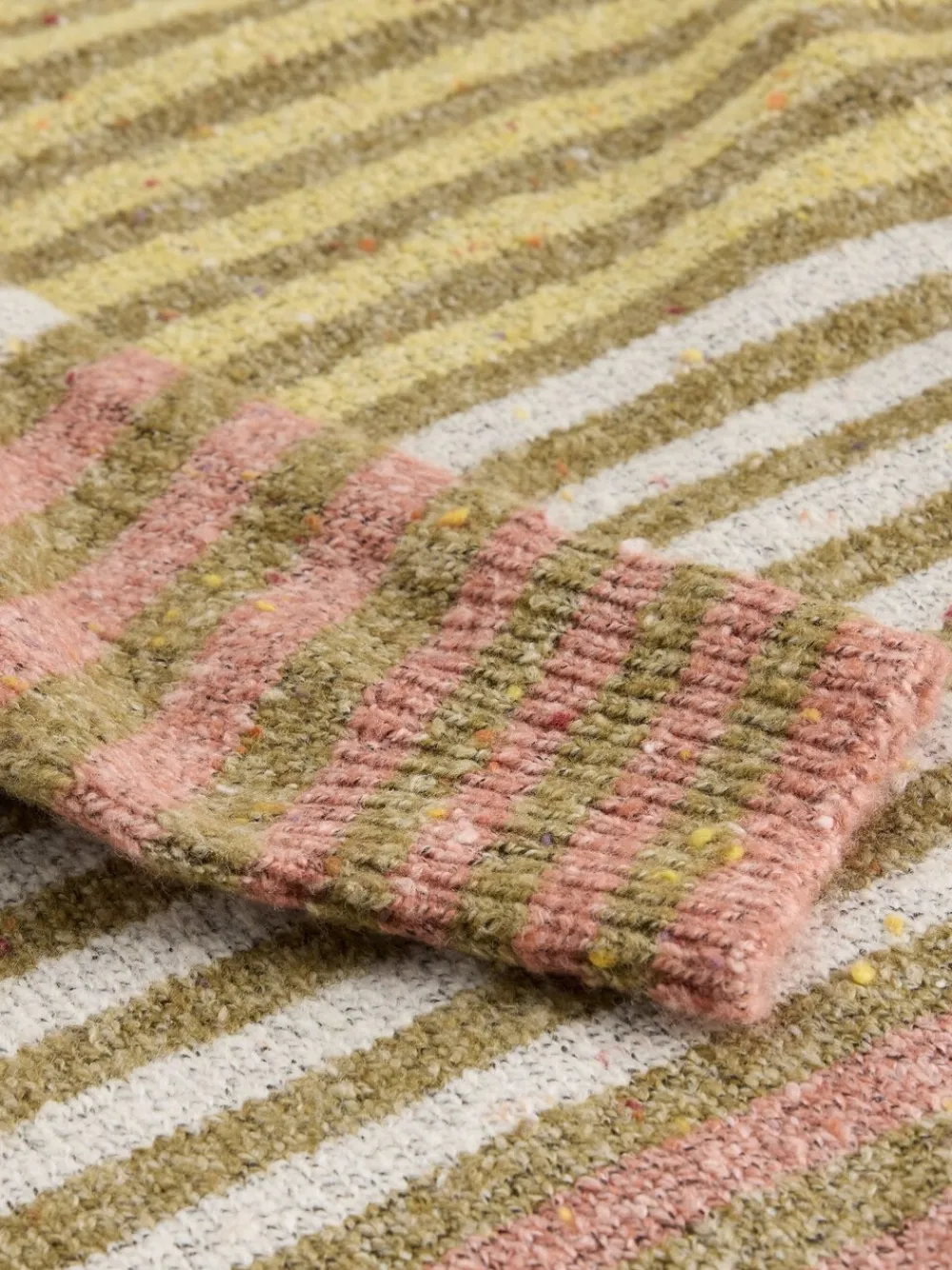 A neppy knitted jumper. (For when it turns a bit nippy.) This one’s soft and cosy. With contrast colour stripes. We think it looks great with denim. Machine washable. 47% Acrylic, 31% Recycled polyester, 20% Organic cotton, 2% Elastane.