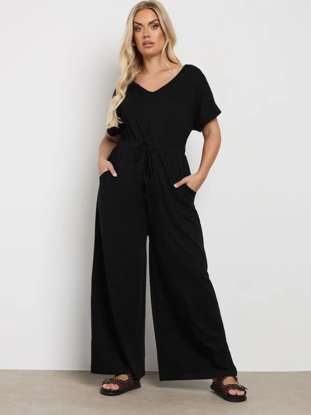Fit Fashion Notes:Welcome a must-have style into your wardrobe this season with this new-in jumpsuit Made from a soft cotton fabric, it features short sleeves, an elasticated waistband with an adjustable tie drawstring, and a wide leg style. Simply style with trainers or sandals for an effortless everyday look. Why We Love It: As easy as it looks, just slip on and go Features: Short sleeves Elasticated waistband Adjustable tie drawstring Wide-leg style Keyhole back with button fastening V-neckline Made from a soft cotton fabric 100 cotton Inside seam measures: 67cm/26.3” Machine washable Model is 5ft 9.5”/176.53cm and size UK 16/EU 44. Machine washable. 100% Cotton.