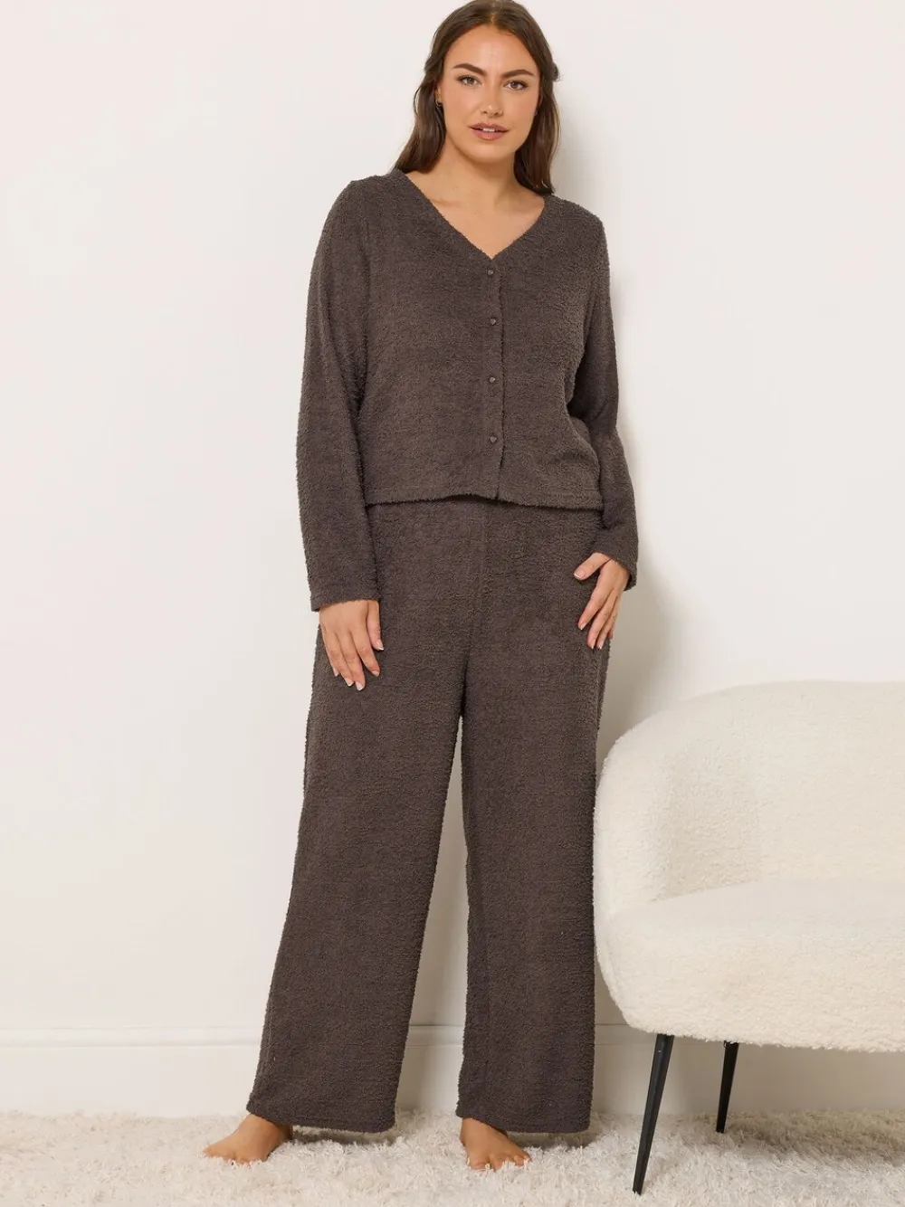 Fit & Fashion Notes:Give your loungewear collection a well-deserved refresh with this new-in cardigan! Made from a soft chenille fabric it features long sleeve and button fastenings. Team with your favourite joggers for the perfect off-duty style!Why We Love It:The layer you’ll be living in! Features: Chenille fabric Long sleeves V-neckline Button fastenings Made from a soft chenille fabric 100 polyester Machine washable Model is 5’10.5/178cm and size UK 16/EU 44. Machine washable. 100% Polyester.