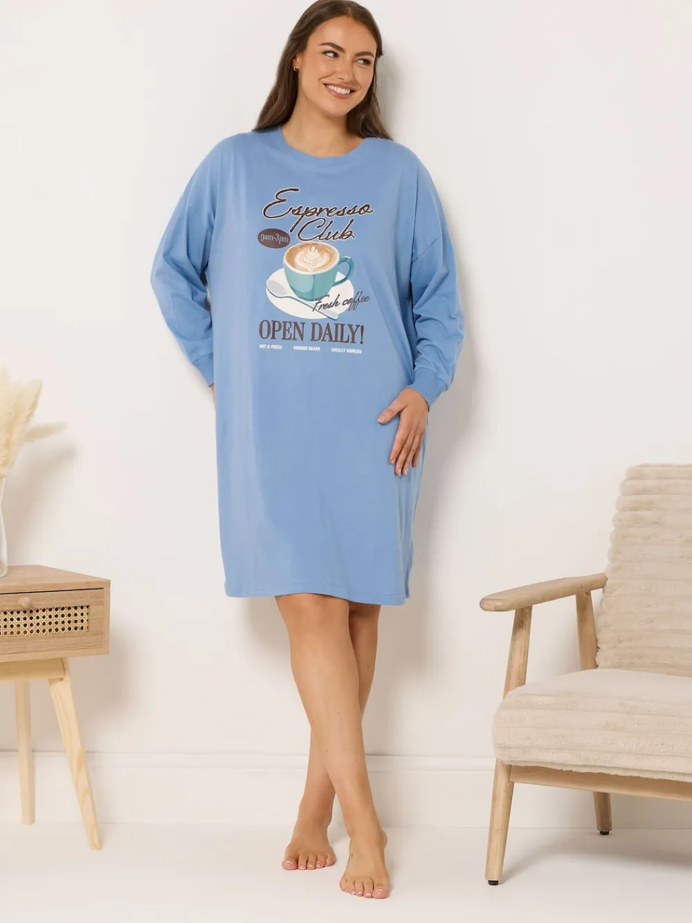 Fit & Fashion Notes: Add a slogan print into your nightwear rotation with this new-in nightdress! Made from a soft cotton fabric, it features an ‘Espresso Club’ slogan with a coffee cup graphic, long sleeves, a crew neckline, and is complete in a knee length. Team with your favourite slippers to complete the look! Why We Love It: The nightdress you’ll be living in this season! Features: Espresso Club slogan Coffee cup graphic Long sleeves Crew neckline Knee length Made from a soft cotton fabric 100 cotton Length from approx: 101cm/39.7 Machine washable Model is 5ft 10.5” / 178 cm and size UK 16 / EU 44. Machine washable. 100% Cotton.