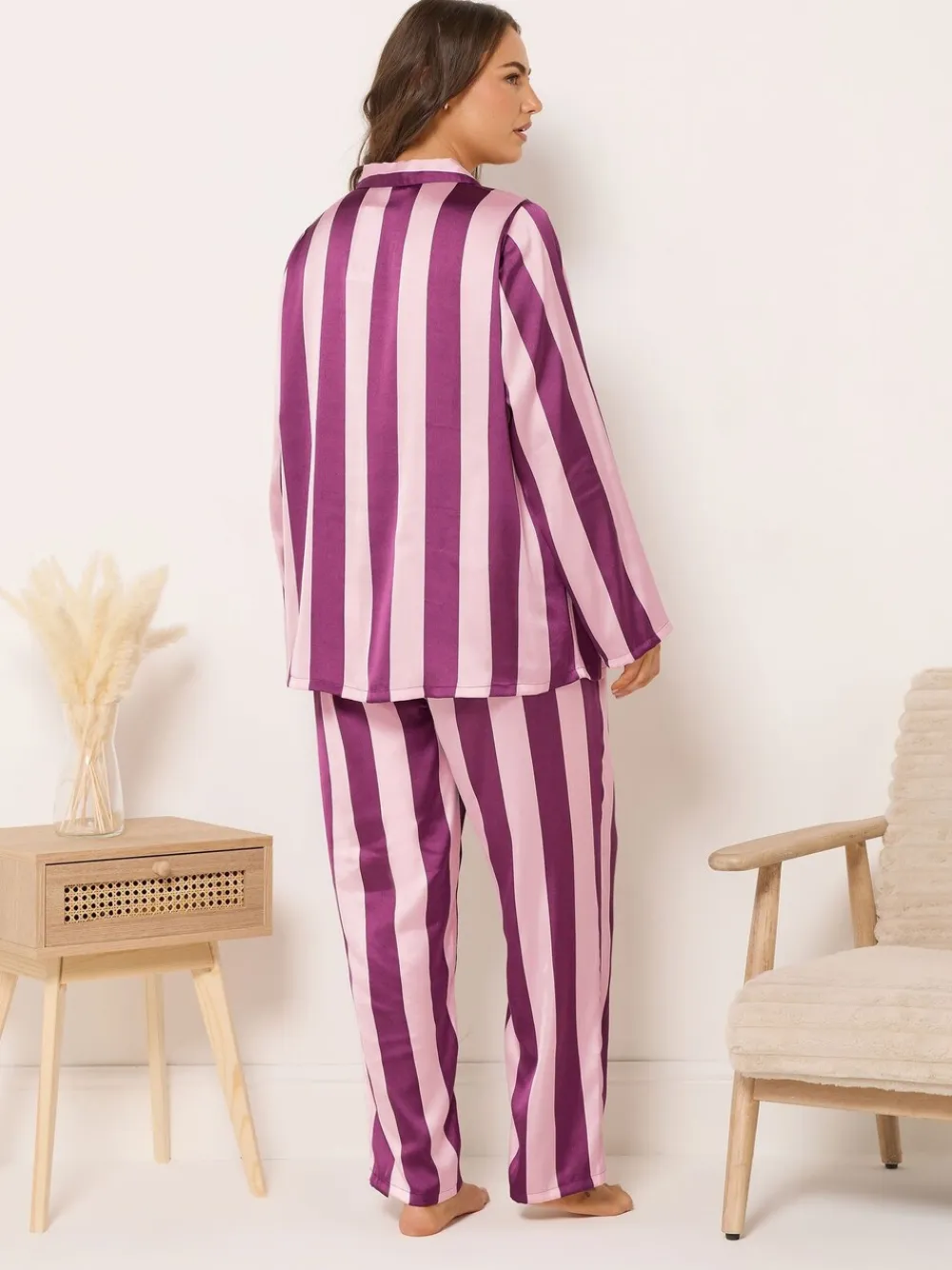 Fit & Fashion Notes: Sleep in style this season with our must-have pyjama set! Made from a soft satin fabric, it features a wide stripe print design, long sleeves, button fastenings, a wide leg style, and an elasticated waistband with an adjustable tie drawstring. Simply complete the look with your favourite slippers! Why We Love It: The pyjamas you’ll be living in this season! Machine washable. 100% Polyester.