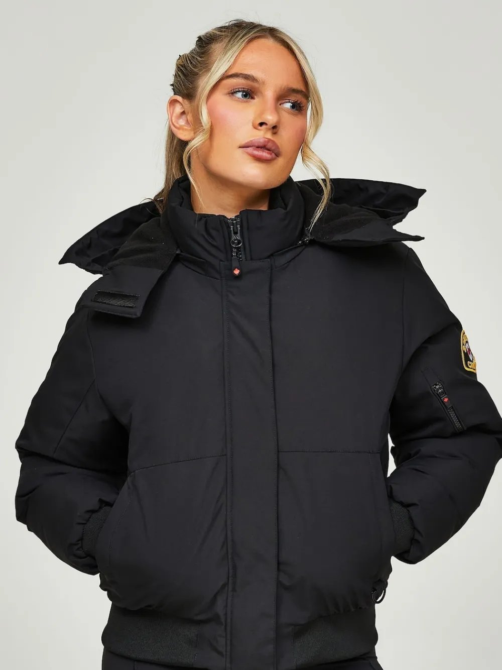 Keep the cold out with this women s Olivia Asphalt Bomber Jacket from Zavetti Canada. This cropped jacket has a full zip front and a popper fastening flap that extends up the chin. The stretchy ribbed trims shape the fit, and the fluffy faux fur trim hood is removable so you can pick and choose the times to unleash it. Finished off with multiple pockets and signature Zavetti Canada branding. Machine washable. 100% Cotton.